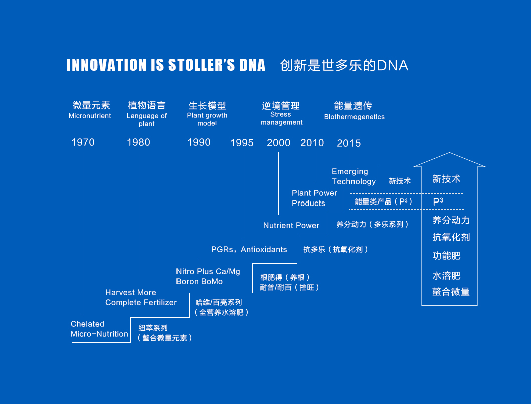 自上世纪80年代开始,世多乐集团在Jerry Stoller先生“了解植物语言”的思维指引下,于90年代初开启了植物遗传表达最大化的研究。通过理念的变革与研究方法的创新,世多乐成为植物生理专家,并研发出全程、全方位、全物候的尖端产品与作物管理方案,帮助作物在整个生育期内更好地抵御逆境胁迫的影响,“发掘植物自身潜力”,获得更高产量。